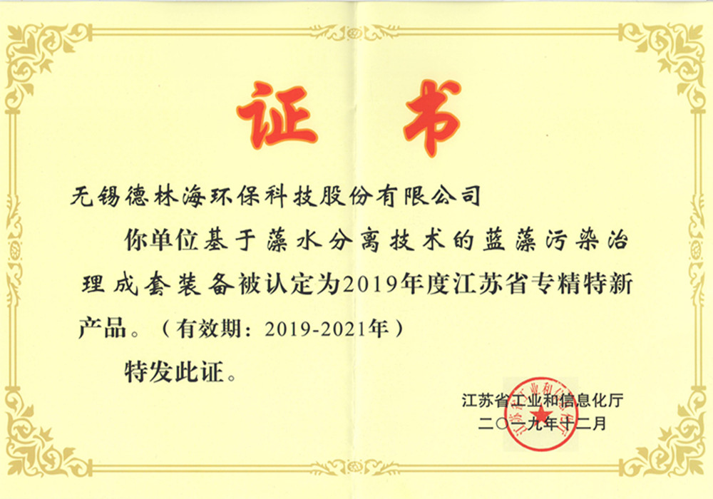 近日,江蘇省工業(yè)和信息化廳公布了2019年度省級(jí)專精特新產(chǎn)品認(rèn)定名單,我司的“基于藻水分離技術(shù)的藍(lán)藻污染治理成套裝備”成功入選。