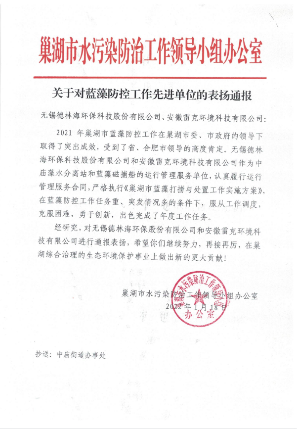 2022年1月18日,巢湖市水污染防治工作領(lǐng)導(dǎo)小組辦公室印發(fā)了《關(guān)于對(duì)藍(lán)藻防控工作先進(jìn)單位的表揚(yáng)通報(bào)》(以下簡稱《表揚(yáng)通報(bào)》),通報(bào)對(duì)于德林海負(fù)責(zé)運(yùn)行的中廟藻水分離站在巢湖藍(lán)藻防控工作中的工作表現(xiàn)和完成情況予以了高度肯定。