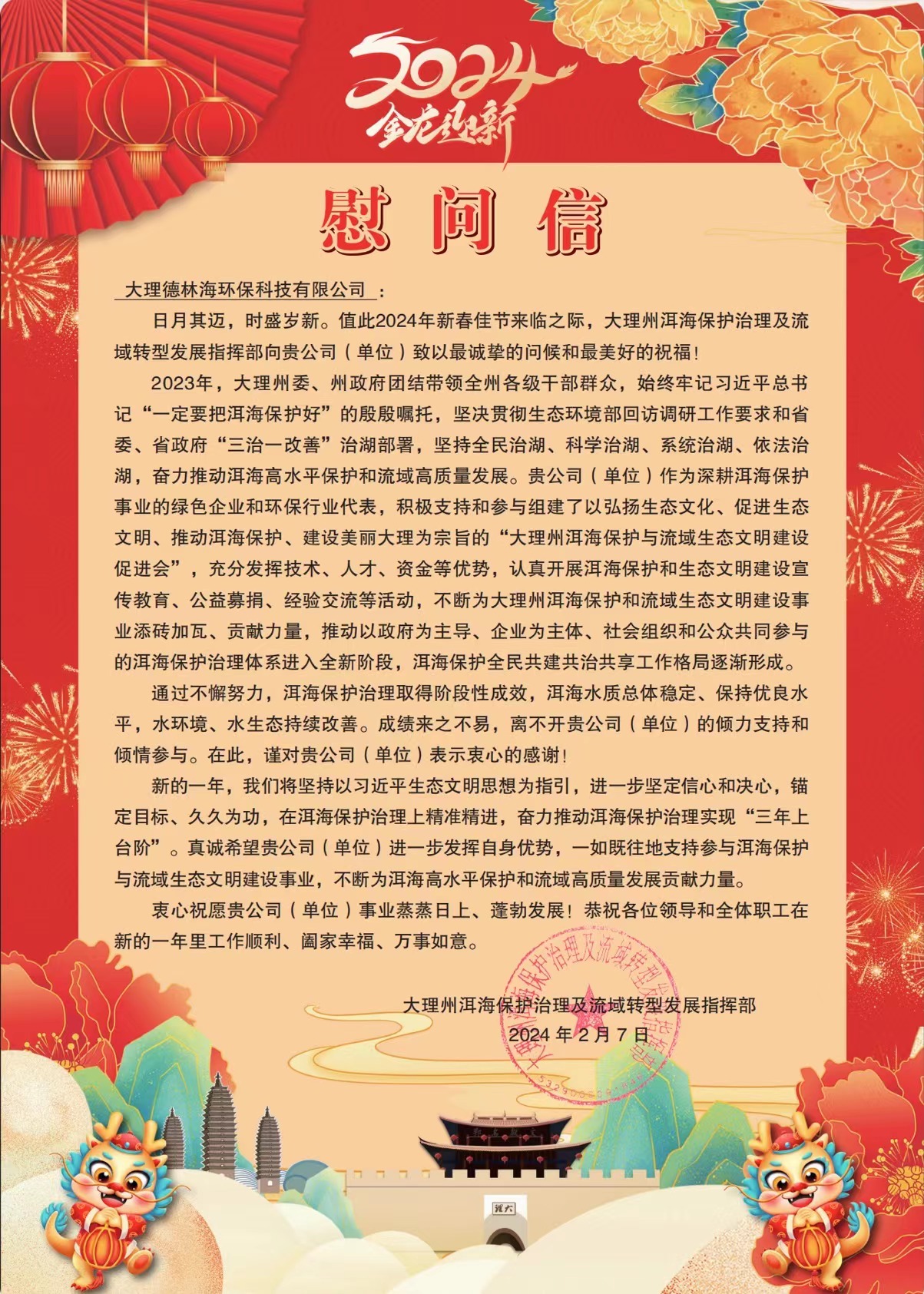 春節(jié)前夕,德林海收到大理州洱海保護治理及流域轉(zhuǎn)型發(fā)展指揮部(以下簡稱指揮部)發(fā)來的一封慰問信,慰問信言辭懇切,對德林海在洱海治理保護工作中的傾力支持和突出貢獻給予了充分肯定,并希望德林海能進一步發(fā)揮自身優(yōu)勢,一如既往地支持參與洱海保護與流域生態(tài)文明建設(shè)事業(yè),不斷為洱海高水平保護和流域高質(zhì)量發(fā)展貢獻力量。慰問信的最后,指揮部為德林海人送上了誠摯的新春祝福。